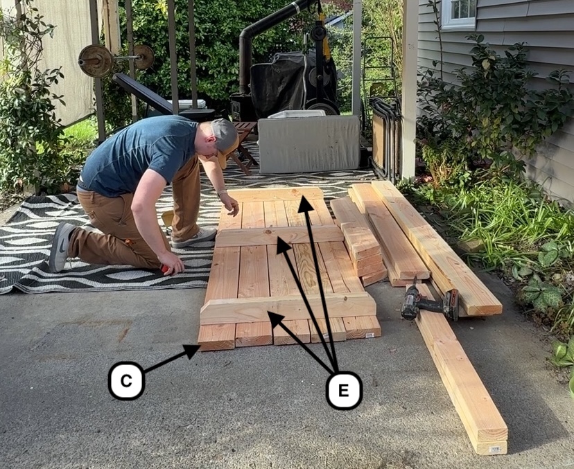 Drill pocket holes in the tabletop supports (part E) as shown in the diagrams. Lay out the five 72 in tabletop slats on a flat surface. Use 1/4 in spacers (scrap plywood works well) between slats for consistent gaps. Position the supports evenly over the slats and screw them in place.
