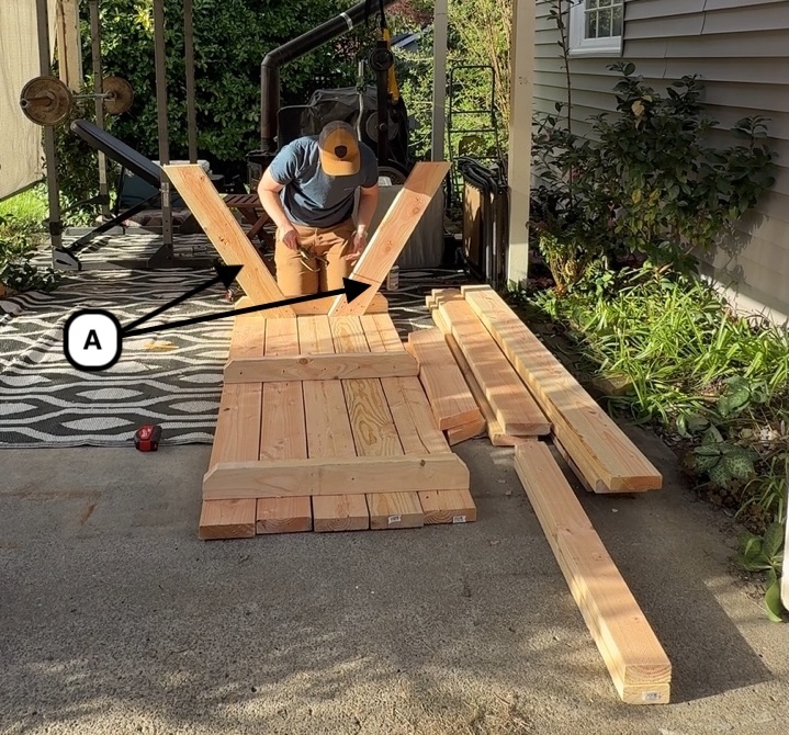 Clamp the legs (part A) to the support structure and drill pilot holes. Add wood glue at each mating surface, then drive exterior screws to lock the joints tight. Predrilling helps prevent splitting.