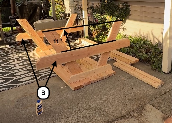 Clamp the seat supports (part B) to the legs. Keep them level before drilling, then glue and screw them into place. I placed the bottom of my 2x6 11" from where the ground will be. This turned out to be a good height for most people.