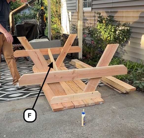 Fasten parts F with 2 1/2 in screws after checking for square and rechecking leg plumb.