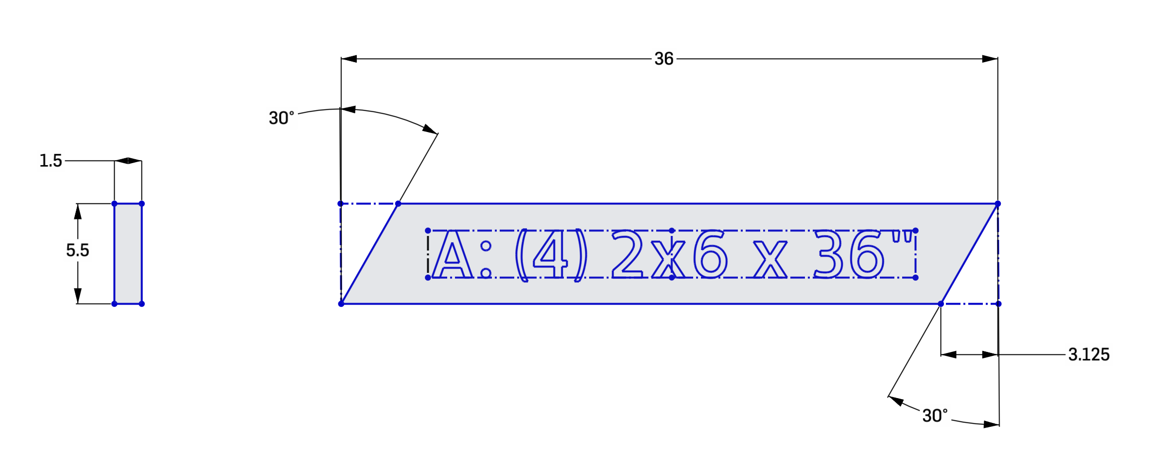30° bevels on both ends, tip-to-tip length 36 in; horizontal run of each angled face about 3.125 in.