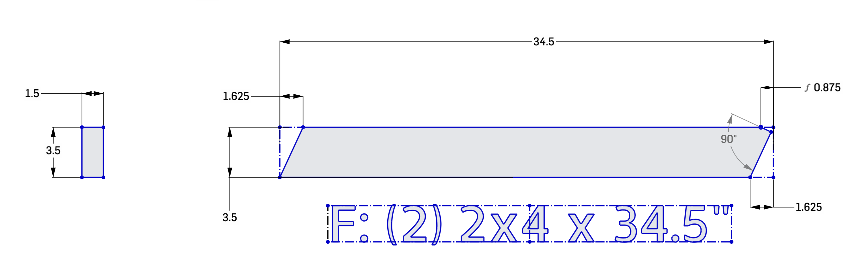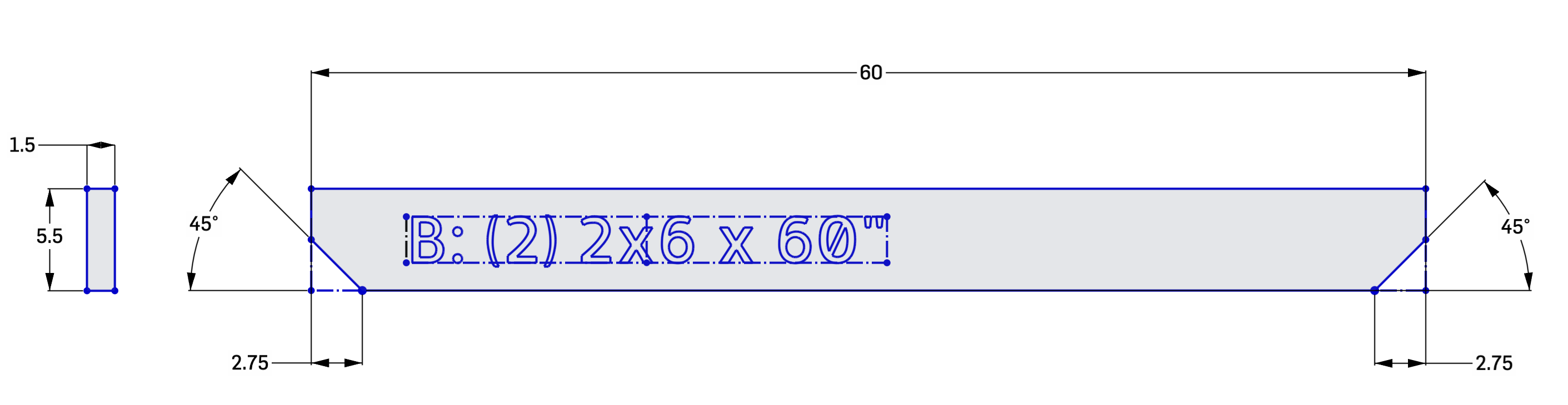 45° miters at both ends; 2.75 in in from each bottom corner along the long edge before the cut (top edge stays 60 in).