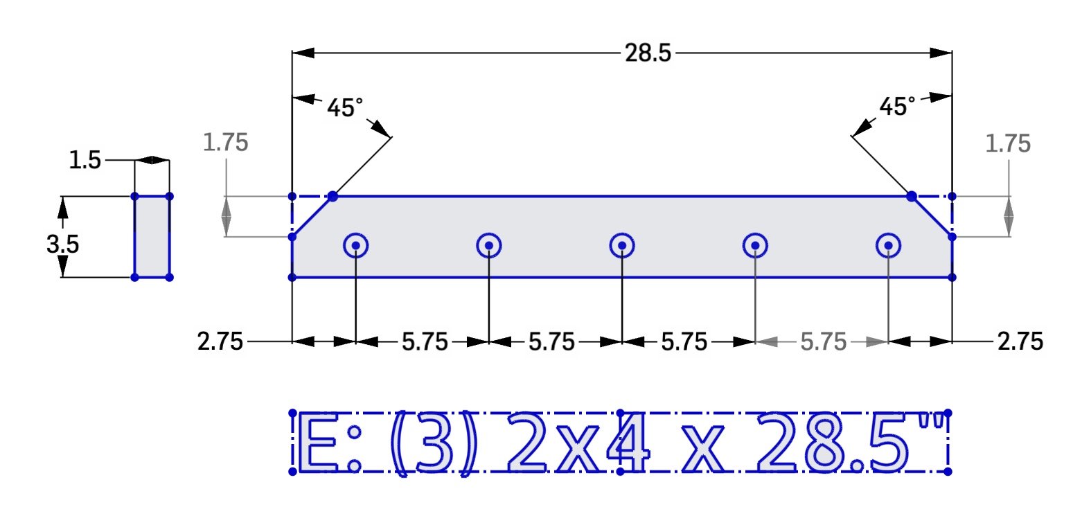 45° cuts at the top corners starting 1.75 in down from the top; five pocketholes along the piece, outer holes 2.75 in from each end, 5.75 in between hole centers (for screws into the tabletop slats).